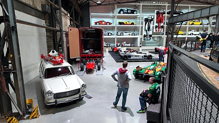 Nachdem man sich gegenseitig begrüßt hatte, konnte jeder nach Lust und Laune das Museum erkunden. Es würde den Rahmen dieses Berichts sprengen, auch nur ansatzweise beschreiben zu wollen, was der Besucher dort zu sehen bekommt. Alleine der sogenannte „Setzkasten“ an der Stirnwand der großen Halle ist atemberaubend und das nicht nur wegen der dort gestapelten Fahrzeuge. Der Clou an der Sache ist, dass man quasi auf Knopfdruck jedes beliebige Vehikel innerhalb kürzester Zeit an die Ausfahrt-Position bugsieren kann. Hierbei werden ggf. mehrere Autos, ähnlich wie beim Tetris-Spiel, in der Hoch- und Längsachse verschoben, bis sich der gewünschte Bolide an der vorgegebenen Position befindet.