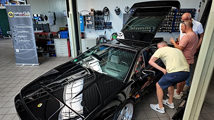 In der großen Halle standen Tische und Bänke bereit. Auch dort hatten die Gäste einen Ausblick auf diverse Lotus-Fahrzeuge, welche fotogen auf den Hebebühnen präsentiert wurden. Natürlich waren auch Nichtmitglieder herzlich willkommen, diese mussten aber einen symbolischen Unkostenbeitrag für die Verpflegung entrichten.