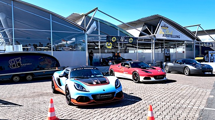 Vor dem Glas-Pavillon wurden Fahrzeuge, sowohl aus der aktuellen Lotus-Modellpallette, als auch Autos älterer Generation präsentiert. Ab Samstag steuerte Komo-Tec weitere Autos unserer Lieblingsmarke hinzu. Insgesamt hatte BF-Sportwagen abermals einen professionellen Auftritt vor Fachkundigem Publikum.