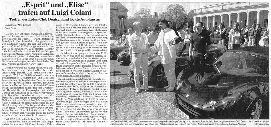 Im Anschluß an die Führung durch die Ausstellung traf man sich mit Herrn Colani auf dem Festplatz zu einem Gruppenfoto. Der Präsident des Lotus Clubs, Hugo Schneider, überreichte dem Designer zur Erinnerung zwei Lotus Elise - Modelle.