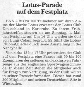 Bei hochsommerlichen Temperaturen um die 28° C war der Lotus Club Deutschland ab 12:00 Uhr mit seinem Stand auf dem Festplatz vor dem Kongresszentrum präsent. Eingerahmt von Stadt-, Schwarzwald-, Nancyhalle und dem Konzerthaus durften hier exclusiv alle mit einem Lotus-Fahrzeug anreisenden Besucher parken. Zahlreiche Clubmitglieder und Lotus-Enthusiasten folgten den Einladungen sowie dem Aufruf in der Presse und dem Internet.