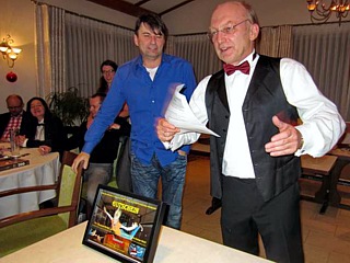 Natürlich gab es heuer auch die üblichen Programmpunkte, wie den Begrüßungs-Cocktail, das umfangreiche Buffet und die Ehrungen verdienter Clubmitglieder. Aber darüber hinaus moderierte unser Ehrenpräsident, Hugo Schneider, eine Tombola, die man mit dem Überbegriff „Spiel ohne Grenzen“ trefflich beschreiben kann. Am Ende gab es einen Gewinner. Aber bis es soweit war, mussten - zunächst in Gruppen, später als Einzelkämpfer - in einem ausgeklügelten Ausscheidungsmodus diverse Aufgaben gelöst werden.
