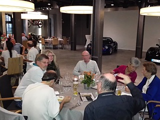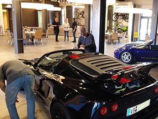 Am PS-Speicher angekommen, wurden die Fahrzeuge von Günther und Ralf während einer spektakulären Aktion in den Raum verfrachtet, in welchem später das gemeinsame Abendessen stattfand. Spektakulär deshalb, weil mit Hilfe eines Transporters, der quasi als Hebebühne fungierte, eine Rampenhöhe von etwa einem Meter überwunden werden musste. Weitere Teilnehmer trafen nach und nach ein und durften an prominenter Stelle parken. Es gab allerdings ein paar Pechvögel, die lange im Stau ausharren mussten und dementsprechend spät ankamen.