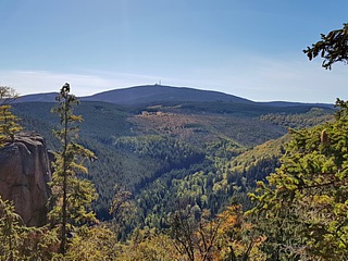 Ein paar Schritte weiter, erreichten wir das Waldgasthaus Rabenklippe. Bei angenehmen Temperaturen und herrlichstem Sonnenschein genossen wir die grandiose Aussicht hinüber zum Brocken. Der Brocken ist mit 1141,2 Meter Höhe der höchste Berg im Mittelgebirge Harz und war zu Zeiten des kalten Kriegs mit seinen nach Westen gerichteten Antennen und Parabolspiegeln die Horch- und Lauschstation der ehemaligen DDR.