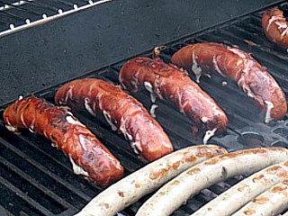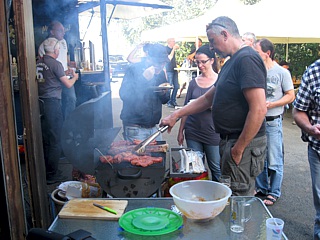 Der Nachmittag verging so wie im Flug und auf mehrfachen Wunsch, mittlerweile hungriger Clubmit-glieder, musste gegen 17:30 Uhr der Holzkohlengrill anfeuert werden. Wie gewohnt wurden vom Bar-, und nun auch schon im dritten Jahr, BBQ-Beauftragten Kai-Uwe Abel gekonnt verschiedne Steaks und Bratwürste zubereitet. Natürlich mit den schon aus den Vorjahren weithin bekannten Grilltechniken, wie dem Vertikalgrillen von Steaks und dem konkaven bzw. konvexen Grillen von Bratwürsten. Was wiederum zu großem Erstaunen und auch vereinzeltem Kopfschütteln bei einigen Clubmitglieder führte. Doch bevor man das leckere Grillgut genießen konnte, hieß es sich in Gedult zu üben und anzustehen.